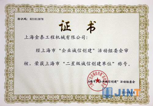 日前,從上海市“企業(yè)誠信創(chuàng)建”辦公室獲悉,上海金泰工程機械有限公司榮獲上海市“二星級誠信創(chuàng)建單位”稱號。這是金泰公司繼去年被評為上海市“誠信星級企業(yè)”以來,誠信星級的再次提升。