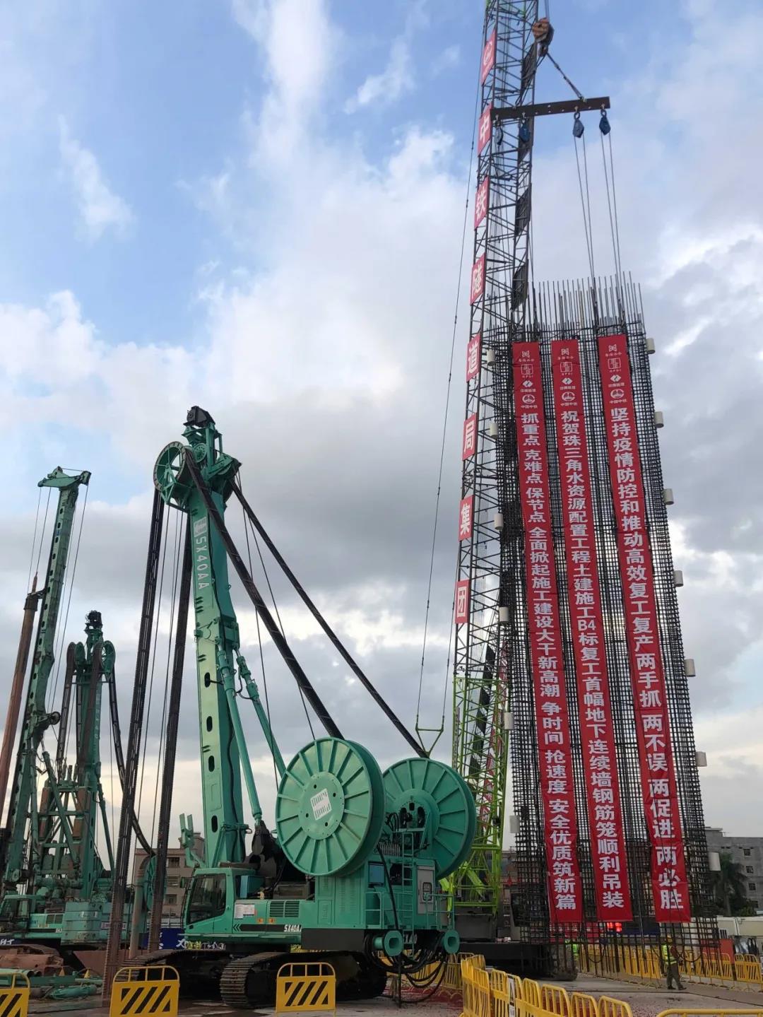水資源項(xiàng)目連續(xù)墻施工主要配備雙輪銑槽機(jī)、旋挖鉆機(jī)、成槽機(jī)等設(shè)備。其中,被譽(yù)為樁工機(jī)械家族“奢侈品”的雙輪銑,作為目前國際上先進(jìn)的地下連續(xù)墻施工專用設(shè)備,通過更換不同類型的刀具即可在不同硬度地質(zhì)中開挖。銑槽機(jī)在復(fù)雜地層條件下的施工效率高、精度高、適應(yīng)性強(qiáng),而且對環(huán)境影響和污染小,在該項(xiàng)目中被確定為主力設(shè)備,并投入數(shù)十臺(tái)。施工中,中外品牌同臺(tái)競技爭奇斗艷,場面蔚為壯觀,其中5臺(tái)金泰雙輪銑設(shè)備在項(xiàng)目中同時(shí)開展施工,SD03#工作井便是上海金泰SX50雙輪銑的杰作,鋼筋籠需沉槽到地下78米處,是上海金泰在珠三角區(qū)域最深的地下連續(xù)墻,也是在廣州做得最深的地下連續(xù)墻。