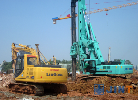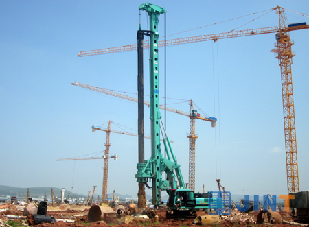 吳圩國際機(jī)場南寧市對外的形象窗口之一,承擔(dān)著極為重要的航空交通責(zé)任,是南寧市重大基礎(chǔ)設(shè)施項(xiàng)目之一。廣西壯族自治區(qū)、南寧市政府都該項(xiàng)目建設(shè)十分重視,專門成立了南寧機(jī)場擴(kuò)建項(xiàng)目工程指揮部,全程跟蹤,協(xié)調(diào)、指導(dǎo)和監(jiān)督,全力推進(jìn)項(xiàng)目建設(shè)。在這一項(xiàng)目中,基礎(chǔ)工程是決定項(xiàng)目進(jìn)度的關(guān)鍵要素,要在紅黏土、密實(shí)黏土、微風(fēng)化白云質(zhì)石灰?guī)r的地層條件下進(jìn)行最深達(dá)24m樁基施工,巖層最大硬度超過10Mpa。這對鉆進(jìn)施工技術(shù)和旋挖鉆機(jī)性能都是嚴(yán)峻考驗(yàn)。在上海金泰現(xiàn)場服務(wù)小組7×24全程保障下,SD28鉆機(jī)不負(fù)眾望,與同工地施工的柳工915D挖掘機(jī)一起,為保障這一重點(diǎn)工程按期完工在日夜運(yùn)作,并交出了一份滿意的答卷,以單樁2-4小時(shí)的效率,遠(yuǎn)超同工地其他品牌產(chǎn)品,贏得鉆機(jī)用戶、業(yè)主單位的好評,在紅土地上又一次創(chuàng)造了金泰綠的佳績。
