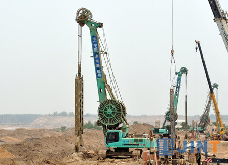 經過一年的奮戰(zhàn),“引黃灌溉龍湖調蓄工程”(簡稱“龍湖工程”)已進入尾聲。據統(tǒng)計,截止2012年6月底,上海金泰工程機械有限公司共有32臺液壓連續(xù)墻抓斗參與“龍湖工程”施工,占到施工抓斗總數三分之二之多。在整個工程防滲墻項目中,幾乎每個標段段都有金泰機械的綠色“唱主角”。針對各標段地質和水文特點,金泰公司因地制宜將工法設計和施工機械完美結合,創(chuàng)新性的拓展了液壓抓斗的應用領域。其中一款重量17噸、架體加長1米的400mm薄壁專用斗架體總成,有效解決了施工中常規(guī)抓斗無法解決的施工難題,得到了施工單位和甲方的一致認可。