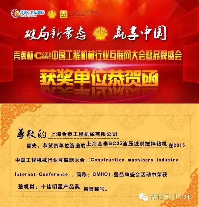 日前,由中國工程機械工業(yè)協(xié)會、長沙經(jīng)濟技術(shù)開發(fā)區(qū)、慧聰工程機械網(wǎng)等機構(gòu)聯(lián)合參與并舉辦的“CMIC2015中國工程機械行業(yè)互聯(lián)網(wǎng)大會暨品牌盛會”系列活動之“2015年工程機械明星產(chǎn)品”評選結(jié)果“鳴鑼定音”,上海金泰SC35雙輪攪拌鉆機榮獲整機類“十佳明星產(chǎn)品”獎。