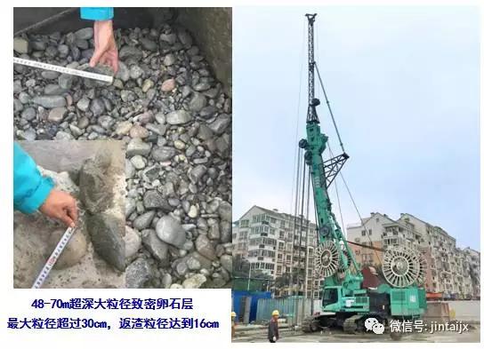 2016年12月——武漢軌道交通七號線八標(biāo)段武昌工作井專項(xiàng)地連墻工程。上海金泰與隧道股份“強(qiáng)強(qiáng)聯(lián)手”,SX40與SG60A“雙機(jī)合璧”,入巖深度10米以上,并成功穿透46MPa中風(fēng)化膠結(jié)礫巖。