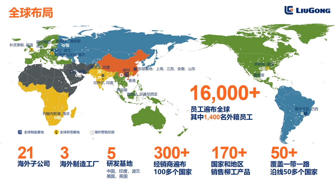 柳工在國際化領(lǐng)域處在行業(yè)的領(lǐng)先地位,全球擁有16000多名員工,300多家經(jīng)銷商、30家海外子公司和機構(gòu)、5個全球研發(fā)基地,產(chǎn)品遠銷170多個國家和地區(qū),國際業(yè)務(wù)覆蓋“一帶一路”沿線85%的國家。近年來,柳工海外市場保持高速增長態(tài)勢。新冠疫情期間,柳工海外業(yè)務(wù)仍逆勢上揚。2021年,柳工海外收入同比大幅增長。今年1月份,銷量同比翻翻,實現(xiàn)高質(zhì)量“開門紅”。