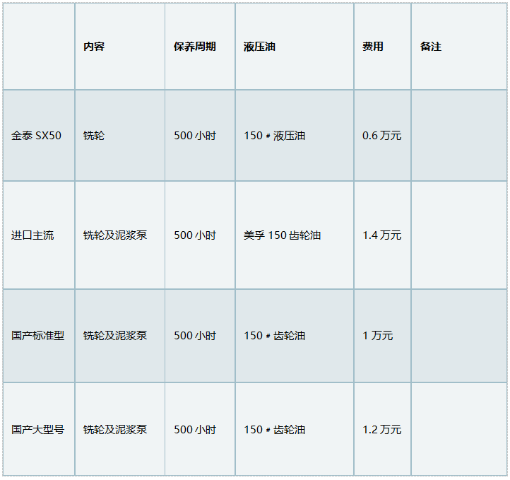 因金泰SX50氣舉反循環(huán)雙輪銑與泵吸雙輪銑結(jié)構(gòu)有著巨大差異,導(dǎo)致保養(yǎng)的費(fèi)用存在巨大差值。泵吸雙輪銑除去與SX50氣舉雙輪銑同項(xiàng)銑輪保養(yǎng)外,另多出的泥漿泵與排渣軟管養(yǎng)護(hù)費(fèi)用。其中光排渣軟管保養(yǎng)付費(fèi)用每?jī)赡昃捅萐X50雙輪銑多出90萬(wàn)以上。反觀金泰SX50雙輪銑除銑輪做保養(yǎng)外,其它養(yǎng)護(hù)費(fèi)用幾乎為“零”。