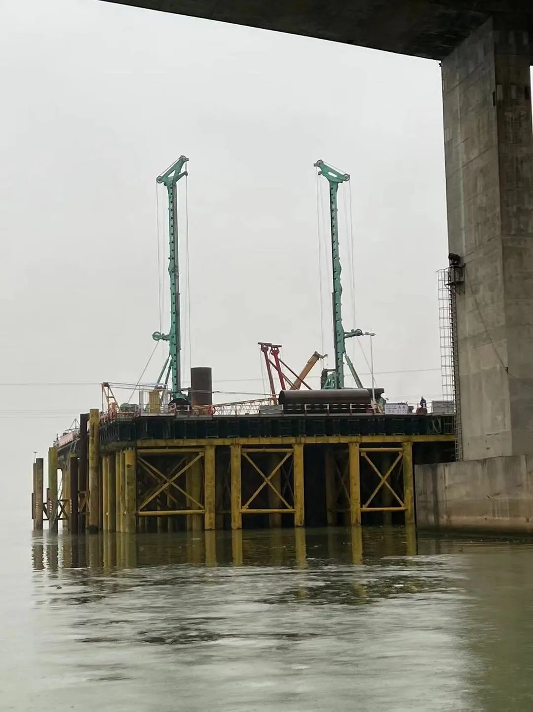 據(jù)悉,佛山特大橋工程位于莞佛高速,富灣特大橋北側(cè)江面承臺(tái)上施工。承臺(tái)為地樁承臺(tái),尺寸為19.15*30.7*4m,采用雙壁鋼圍堰施工,該承臺(tái)圍堰的同時(shí)也作承臺(tái)模板使用,高度41m。