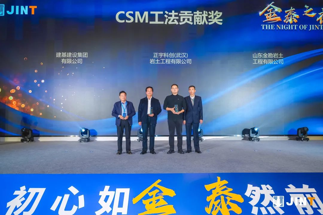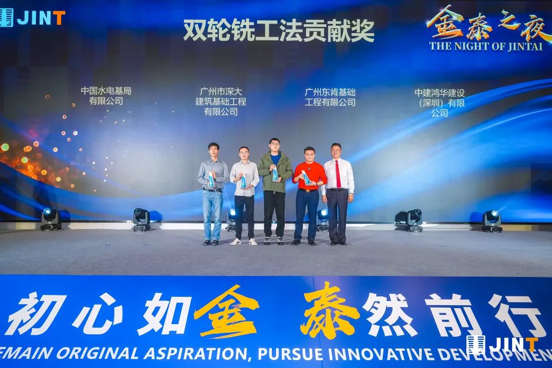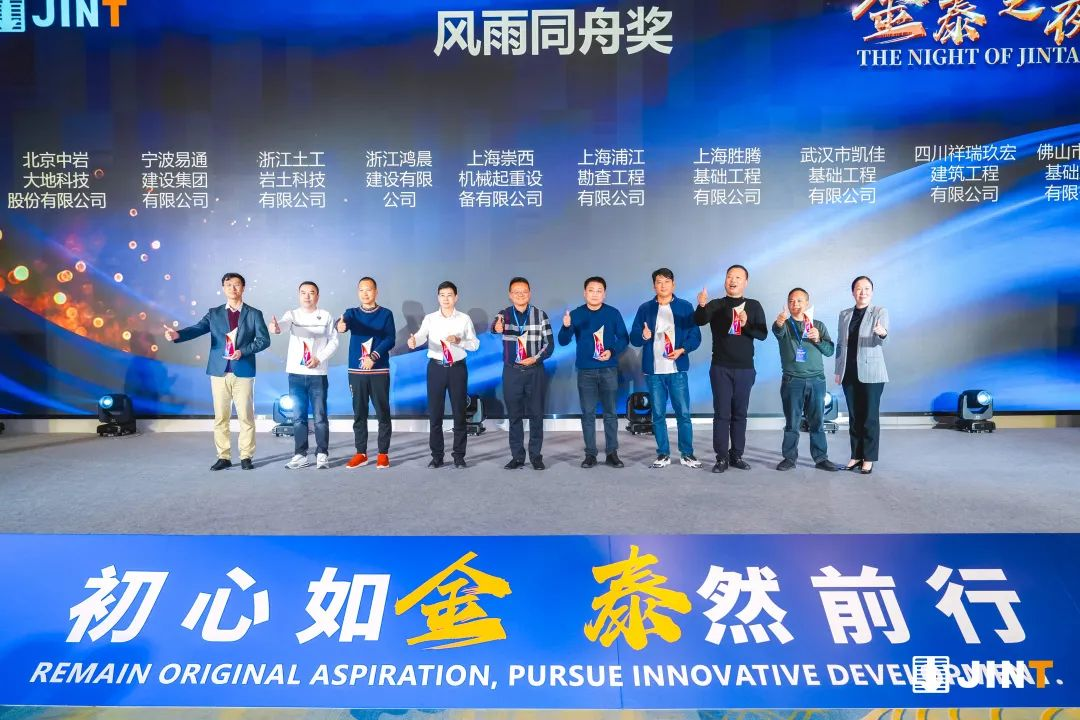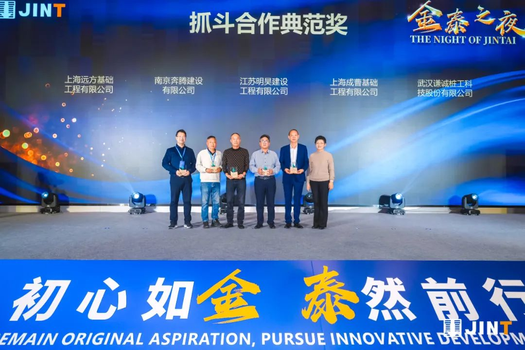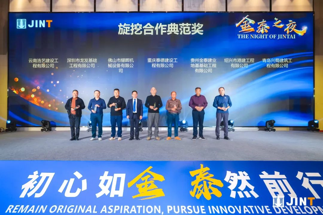 在“金泰之夜”答謝晚宴開始前,袁世國董事長、丁靜羽副董事長、金泰經營團隊為與金泰保持長期良好合作,對金泰產品和技術進步起到重要推動作用的行業(yè)客戶、專業(yè)客戶頒發(fā)了卓越合作獎、風雨同舟獎、抓斗合作獎、旋挖合作獎、CSM工法貢獻獎、雙輪銑貢獻獎等6大類共41個獎項。